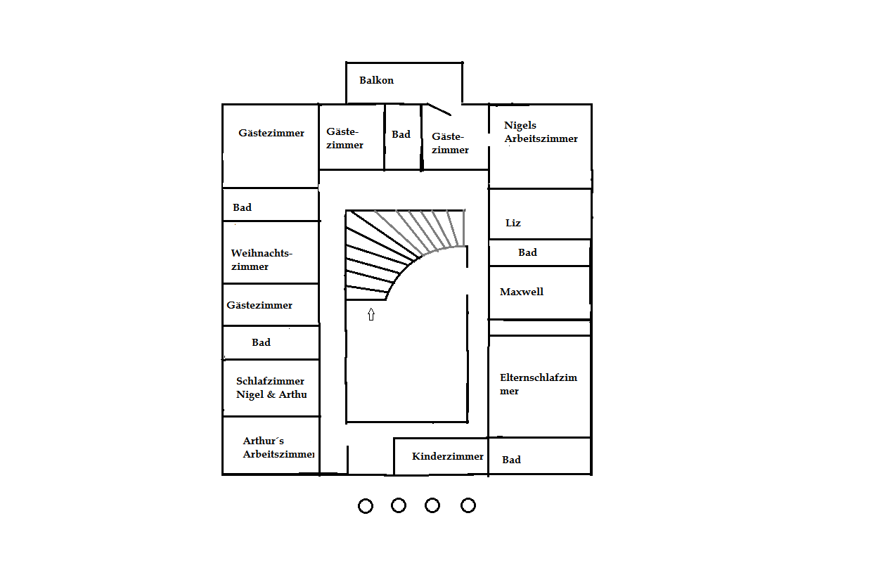 „Im ersten Stock befinden sich zehn Schlafzimmer, fünf Bäder und zwei Arbeitszimmer“, erklärte Nigel während sie die Treppe hochgingen. „Wie du vielleicht bemerkt hast, ist das Haus beinahe quadratisch. Die Glaskuppel bildet die Mitte, um die sich alle Räume gruppieren. Je zwei Schlafzimmer teilen sich ein Bad.“